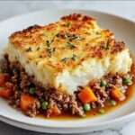 This classic British Shepherd’s Pie features a savory ground lamb or beef filling enriched with vegetables and herbs, topped with creamy mashed potatoes baked to a golden finish. Perfect for a comforting main course, it combines tender meat, flavorful veggies, and a smooth potato crust for a hearty, satisfying meal.