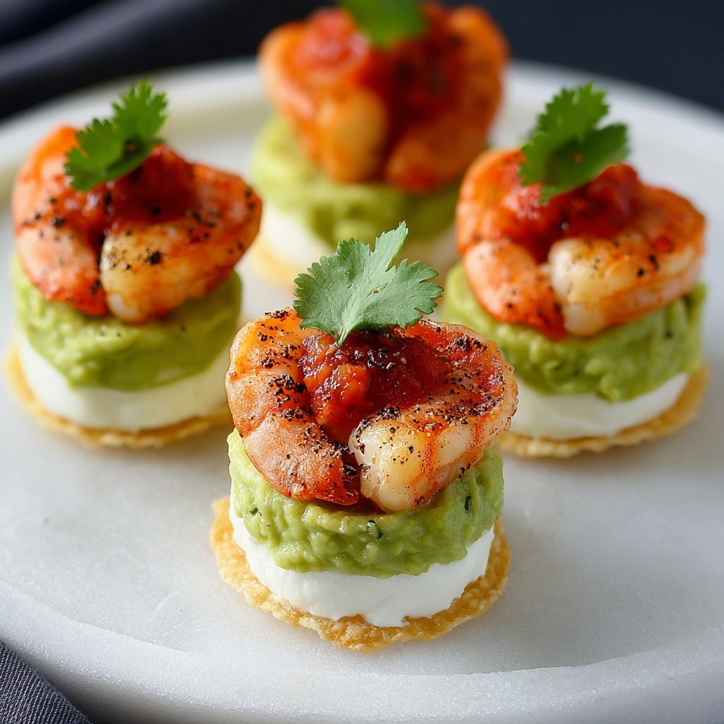 These Shrimp Taco Bites are a flavorful and colorful appetizer featuring marinated, pan-seared shrimp served on scoop-style tortilla chips with creamy sour cream, fresh avocado, tangy salsa, and optional cilantro and lime for a refreshing finish. Perfect for parties or as a light snack, they offer a delightful blend of spicy, citrusy, and savory flavors in every bite.