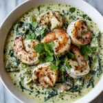 Shrimps in Culichi Salsa is a flavorful Mexican main course featuring tender shrimp cooked in a creamy, green poblano and spinach salsa. This dish combines the freshness of cilantro, the mild heat of jalapeño, and the richness of Mexican crema and cheese, creating a vibrant and satisfying meal perfect for serving with rice, tortillas, or pasta.