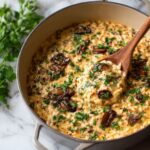 Remove the lid to check the rice — it should be tender with just a slight amount of liquid left around it. Quickly cover again and let the entire pan rest off the heat for 10 minutes. This resting period allows the rice to finish steaming and soak up every last bit of sauce, making it irresistibly creamy.