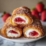 Delight in these Strawberry Cheesecake Stuffed Eggroll Bites, a fusion dessert combining creamy cheesecake filling with fresh strawberries, wrapped in crispy fried egg roll wrappers. Perfect for parties or a sweet treat, these bites offer a golden, crunchy exterior with a luscious, fruity center, dusted lightly with powdered sugar and served with optional dipping sauces for an extra indulgence.