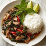 Thai Basil Chicken is a flavorful and aromatic stir-fry dish featuring tender chicken thighs cooked with garlic, Thai chilies, onions, and savory sauces, finished with fresh Thai basil leaves. This quick and easy recipe delivers a delicious balance of spicy, salty, and sweet flavors, making it a perfect weeknight dinner served over jasmine rice and garnished with lime.