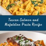 Tuscan Salmon and Mafaldine Pasta is a creamy, flavorful Italian-inspired dish featuring seared salmon fillets combined with tender mafaldine pasta and a rich sauce made from sun-dried tomatoes, spinach, cherry tomatoes, garlic, and Parmesan cheese. This dish offers a beautiful balance of textures and vibrant colors, making it perfect for a gourmet weeknight dinner or special occasion.