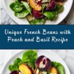 A refreshing and unique French beans salad featuring tender green beans sautéed with shallots and almonds, topped with fresh basil and sweet white peach slices. This vibrant dish combines crisp textures and fresh flavors, perfect as a light appetizer or side.