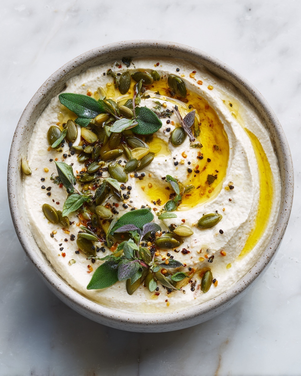 Serve it with an assortment of dippables like pita chips, fresh veggies, and artisan crackers. Present it in a beautiful bowl with a drizzle of honey and vibrant garnishes to make it the center of your appetizer table.