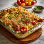 This White Bean and Pesto Bake is a hearty, comforting casserole combining brown rice, creamy cannellini beans, fresh cherry tomatoes, and flavorful pesto. Topped with crunchy panko crumbs and Parmesan cheese, it’s a delicious vegetarian one-dish meal perfect for family dinners or meal prep.