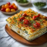 This White Bean and Pesto Bake is a hearty, flavorful vegetarian casserole blending tender brown rice, creamy cannellini beans, fresh pesto, and juicy cherry tomatoes. Topped with crispy panko crumbs and savory Parmesan cheese, this dish offers a comforting and nutritious meal perfect for family dinners or meal prep.